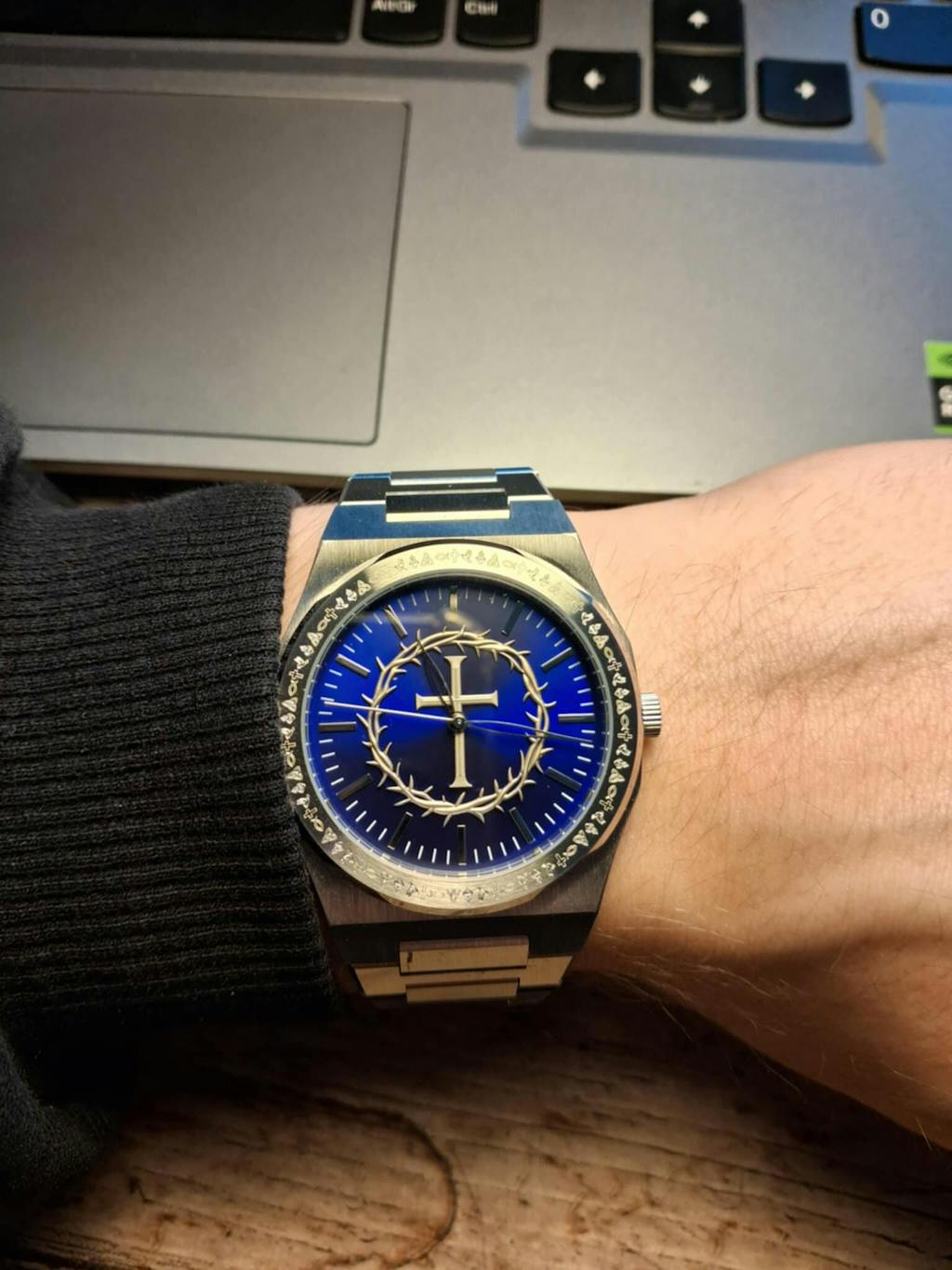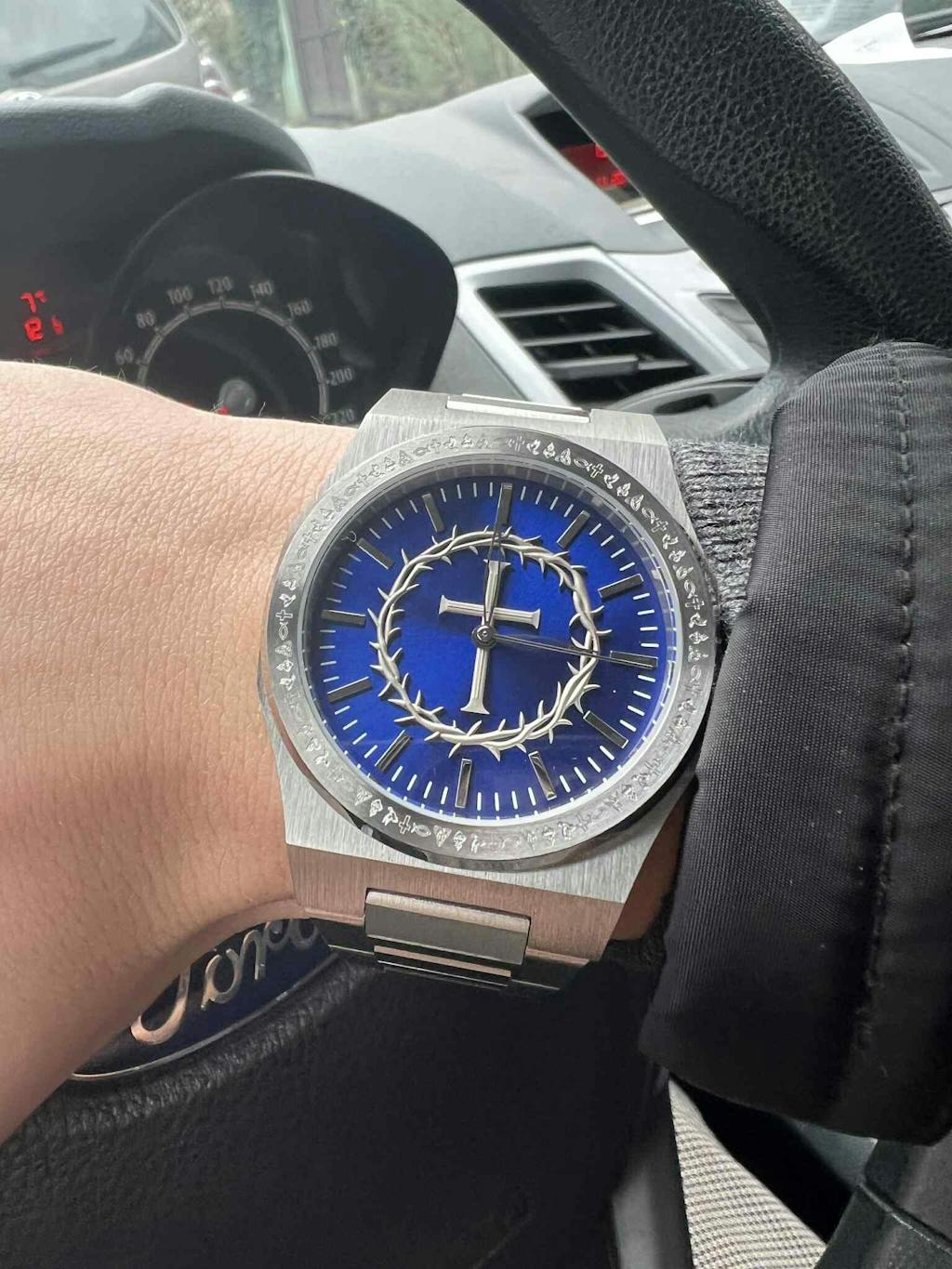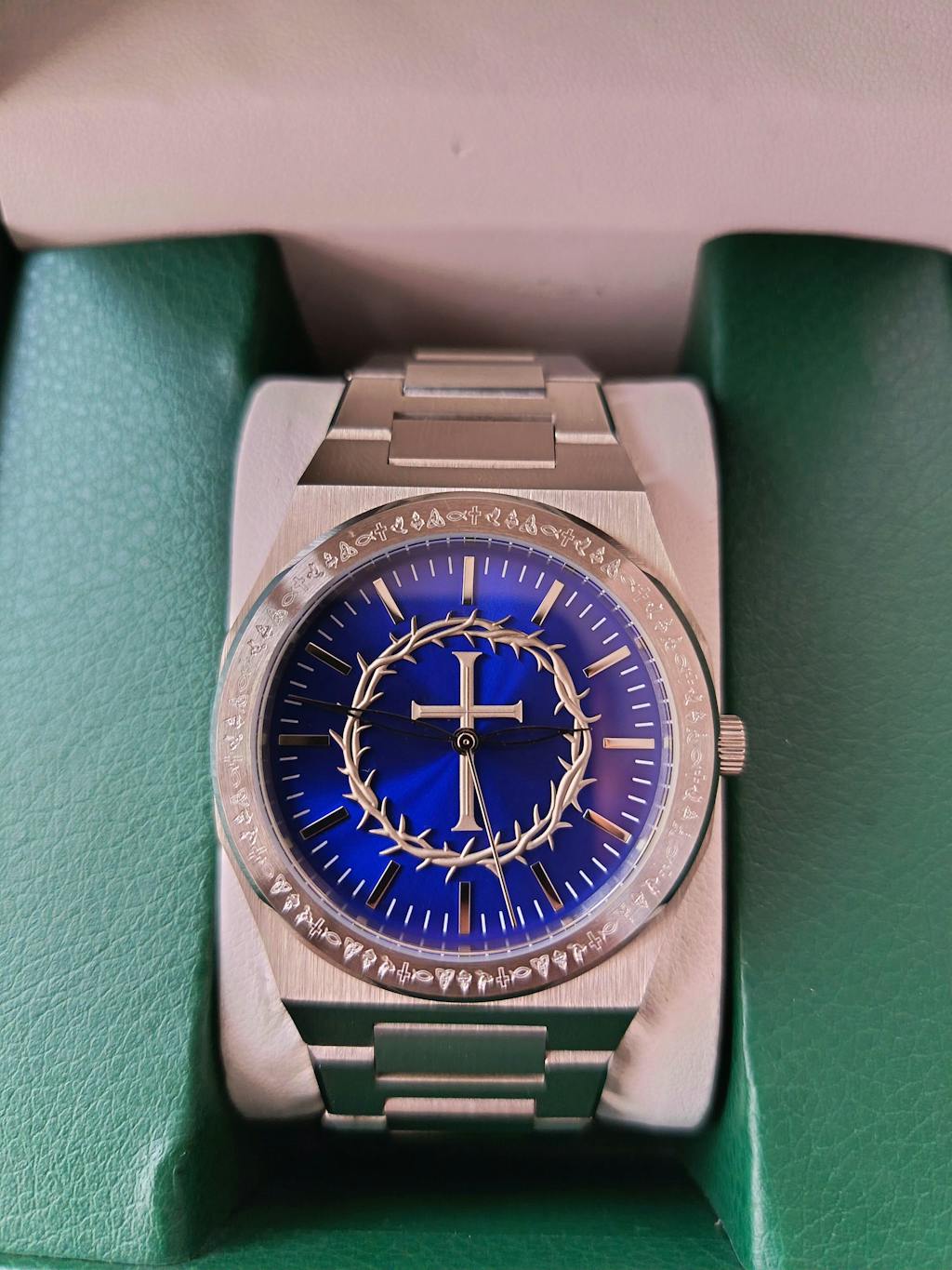 Yes – the center shows a raised silver cross encircled by a crown of thorns in 3D, while the bezel is engraved with detailed Christian symbols.