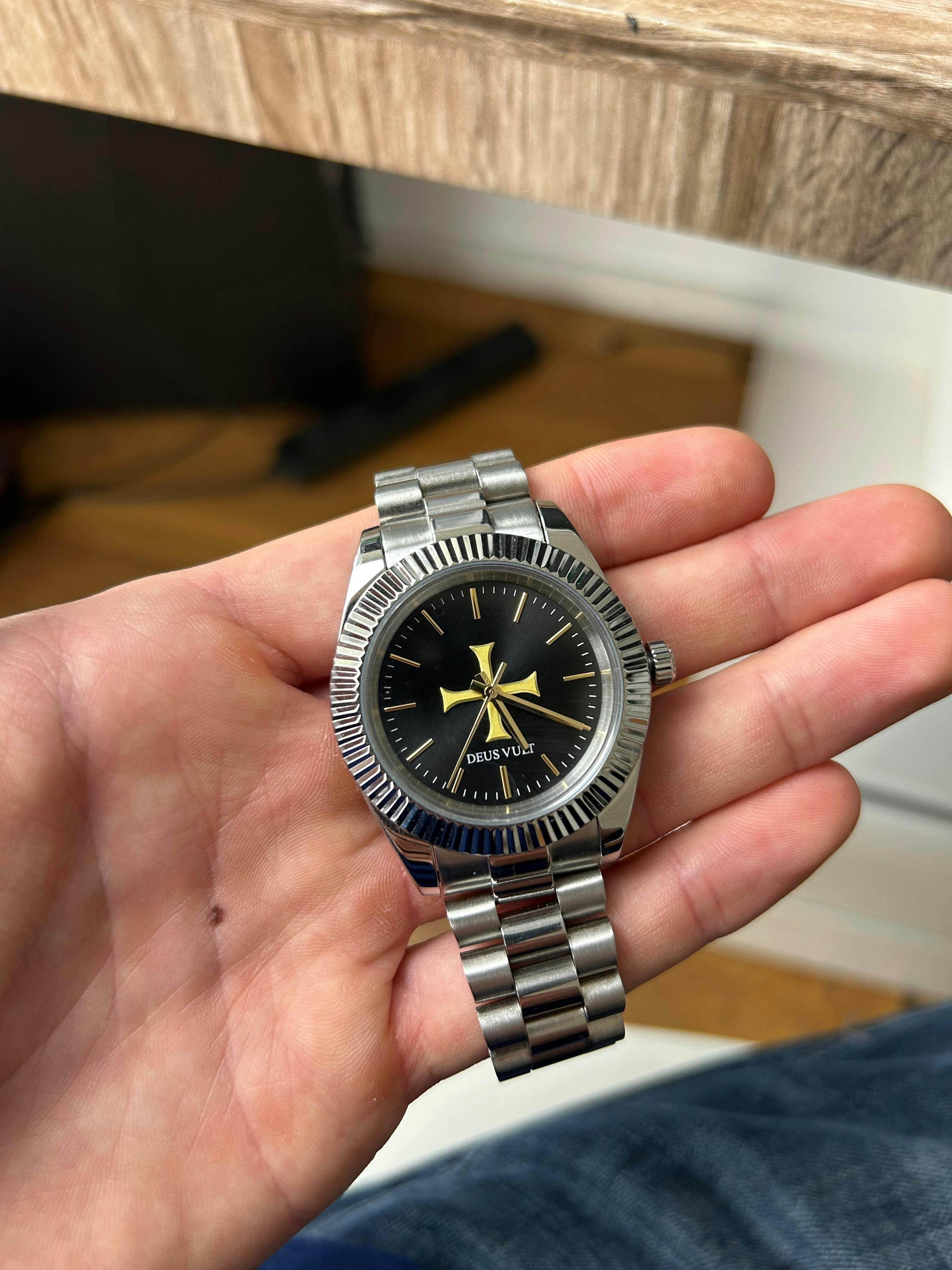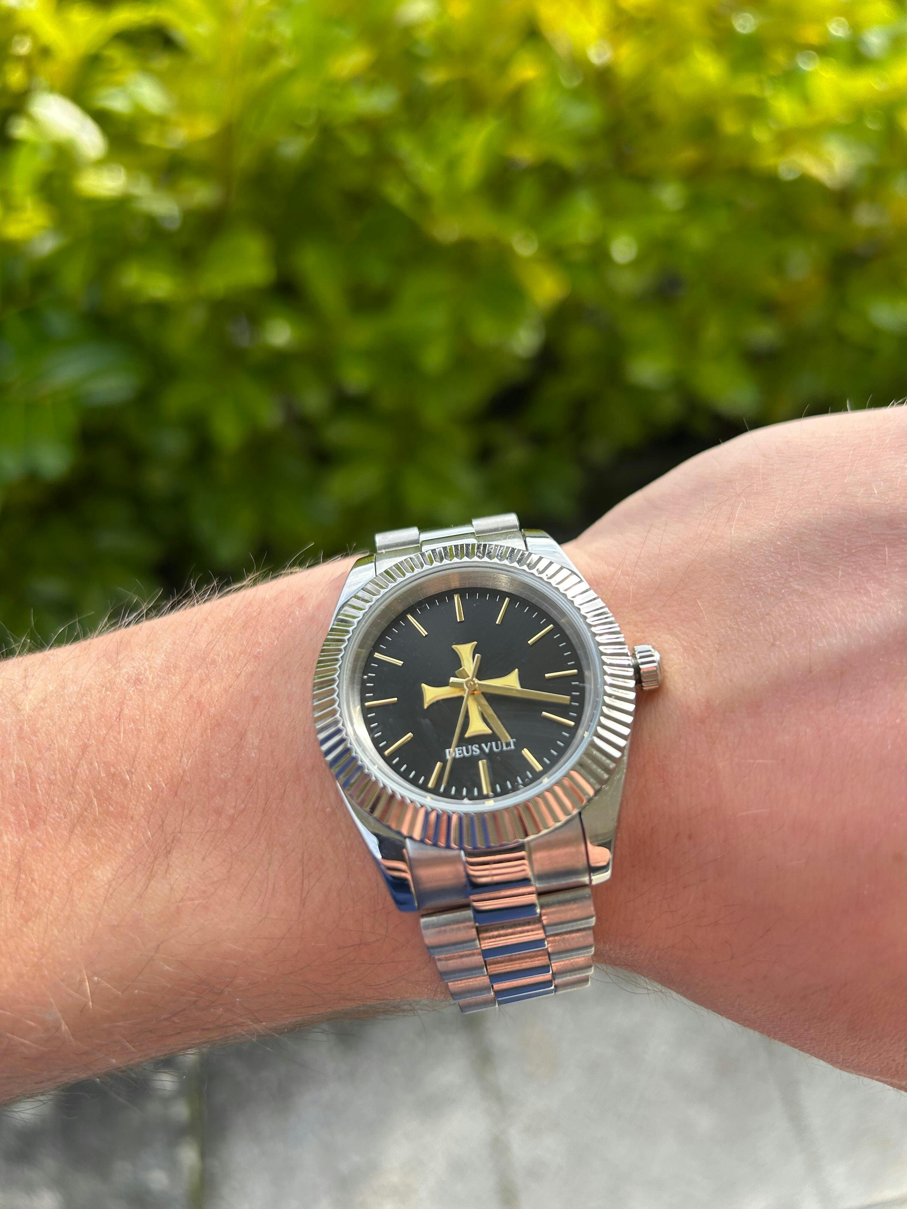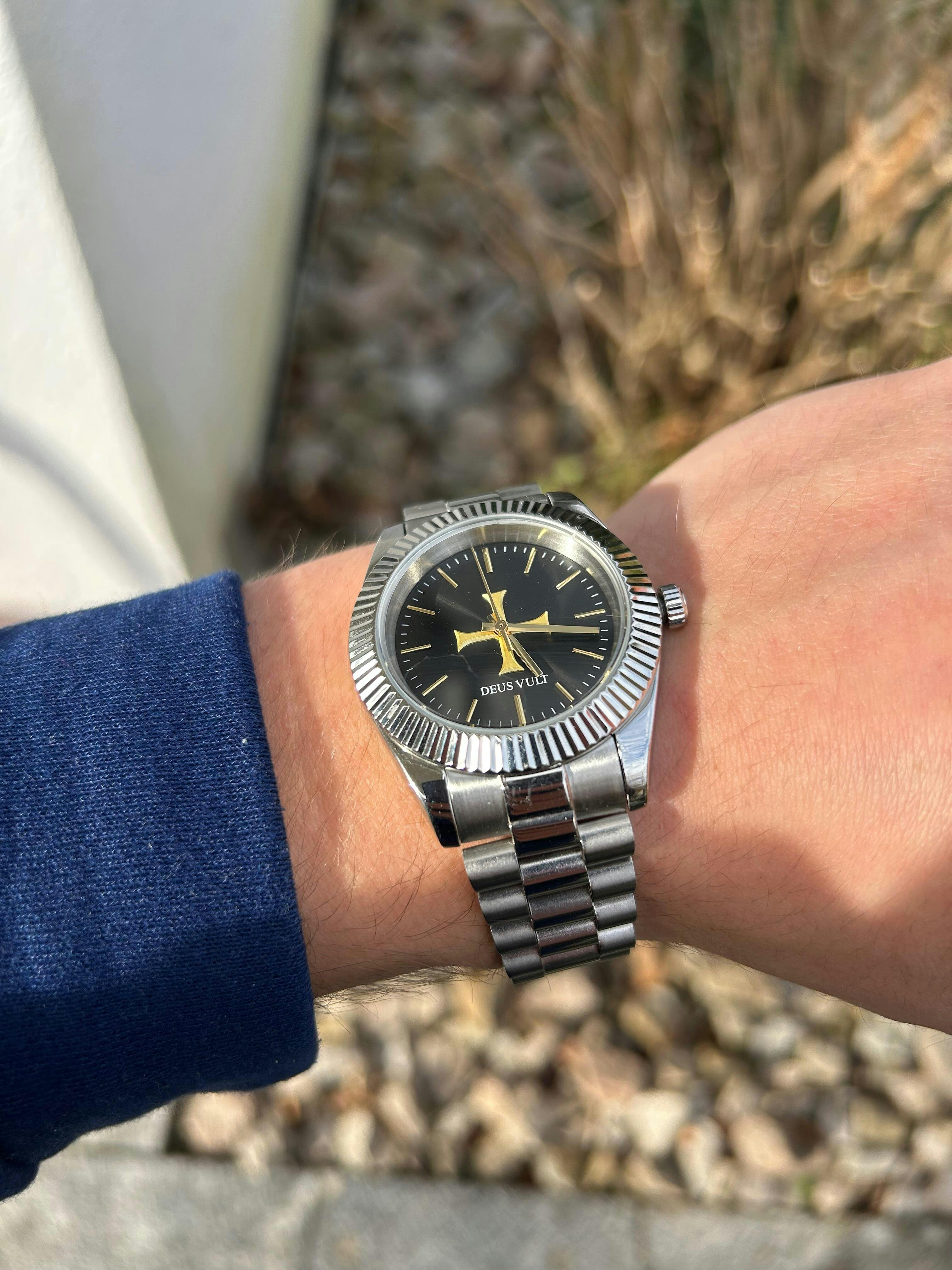 Yes – the center features a raised gold Templar cross in 3D on a black sunray dial, with “Deus Vult” engraved beneath it.