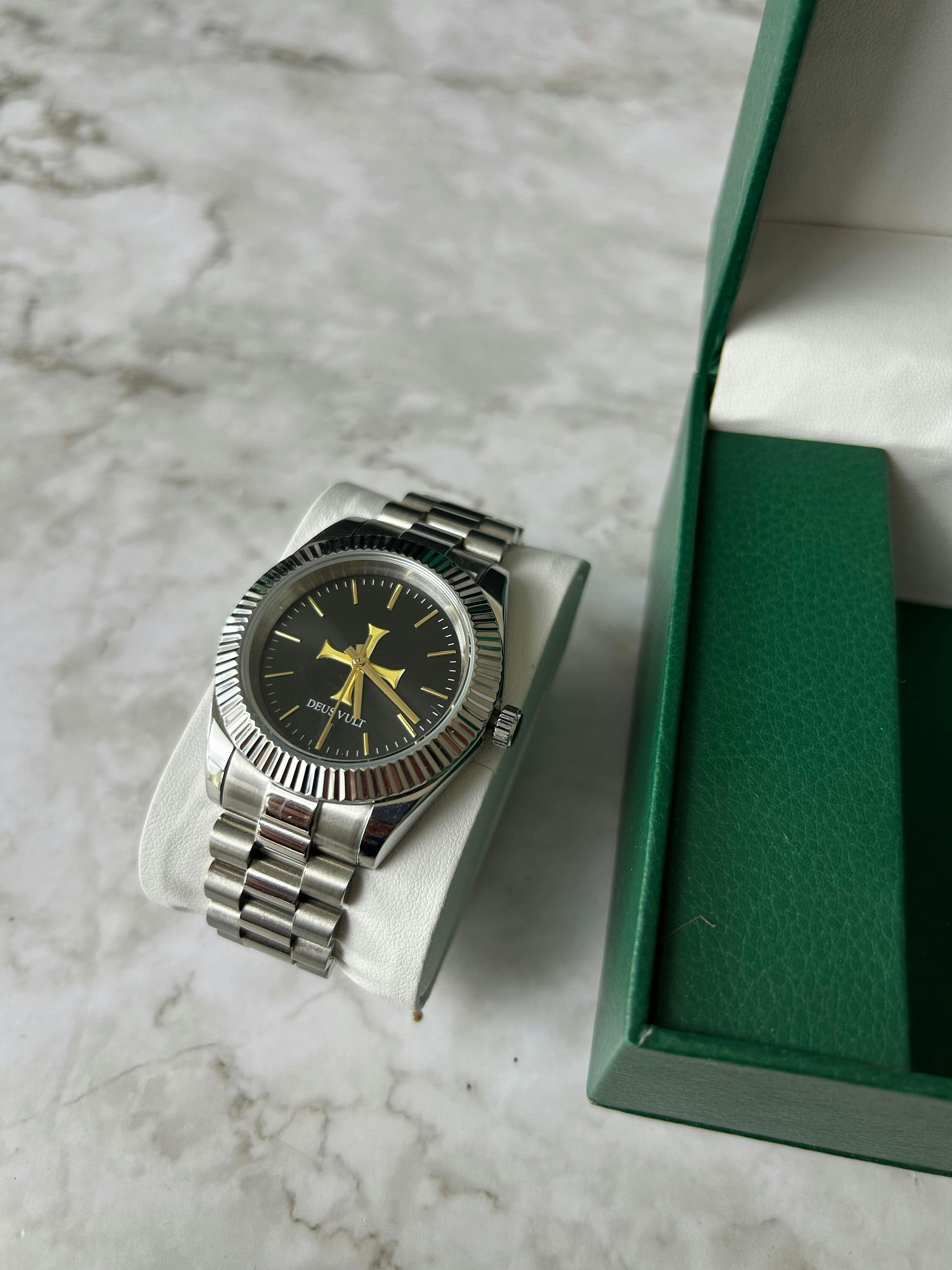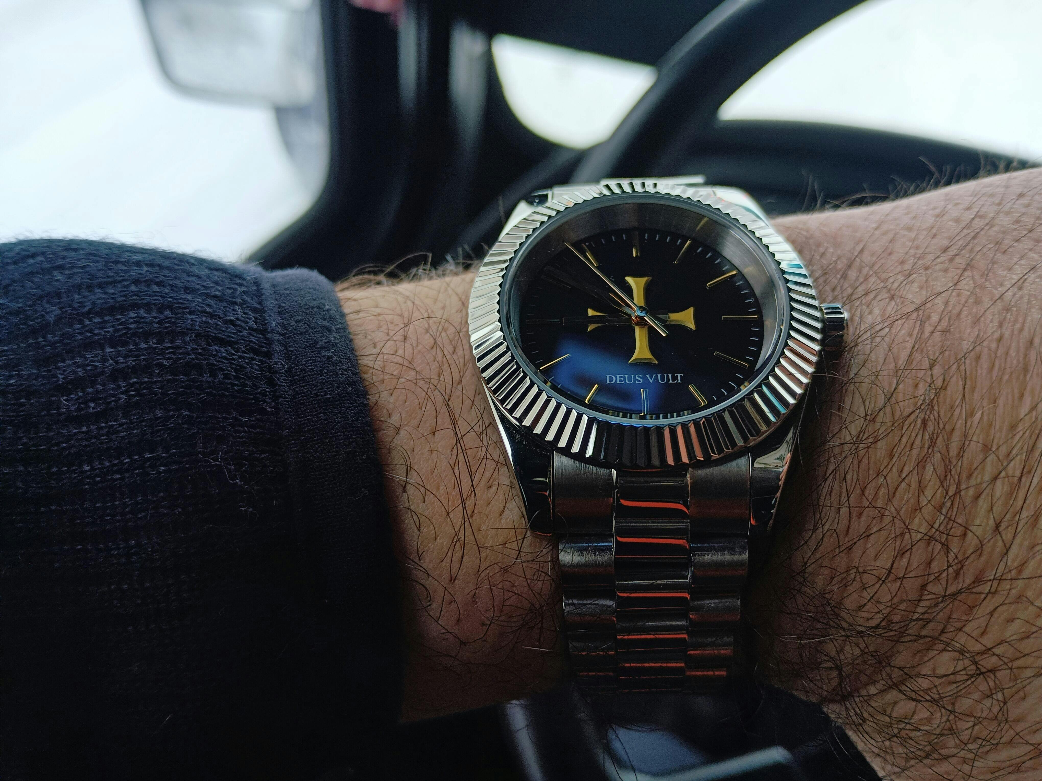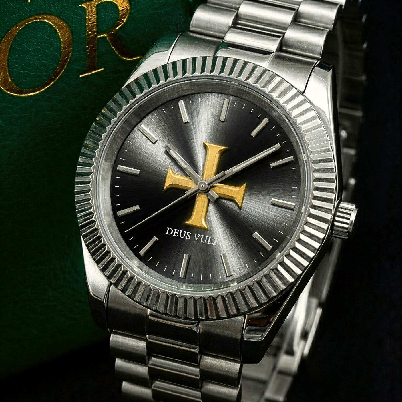 Yes – the center features a raised gold Templar cross in 3D on a black sunray dial, with “Deus Vult” engraved beneath it.
