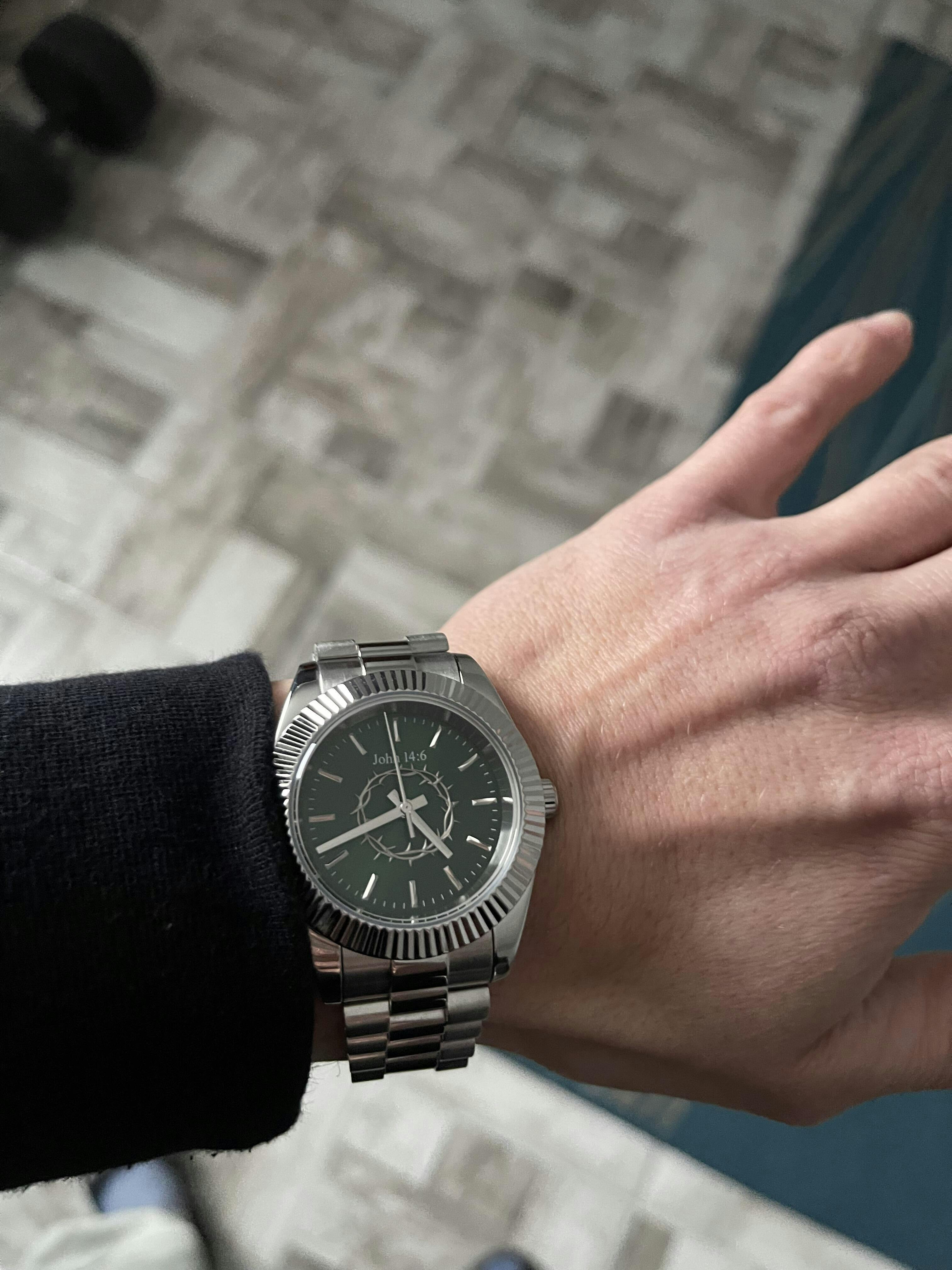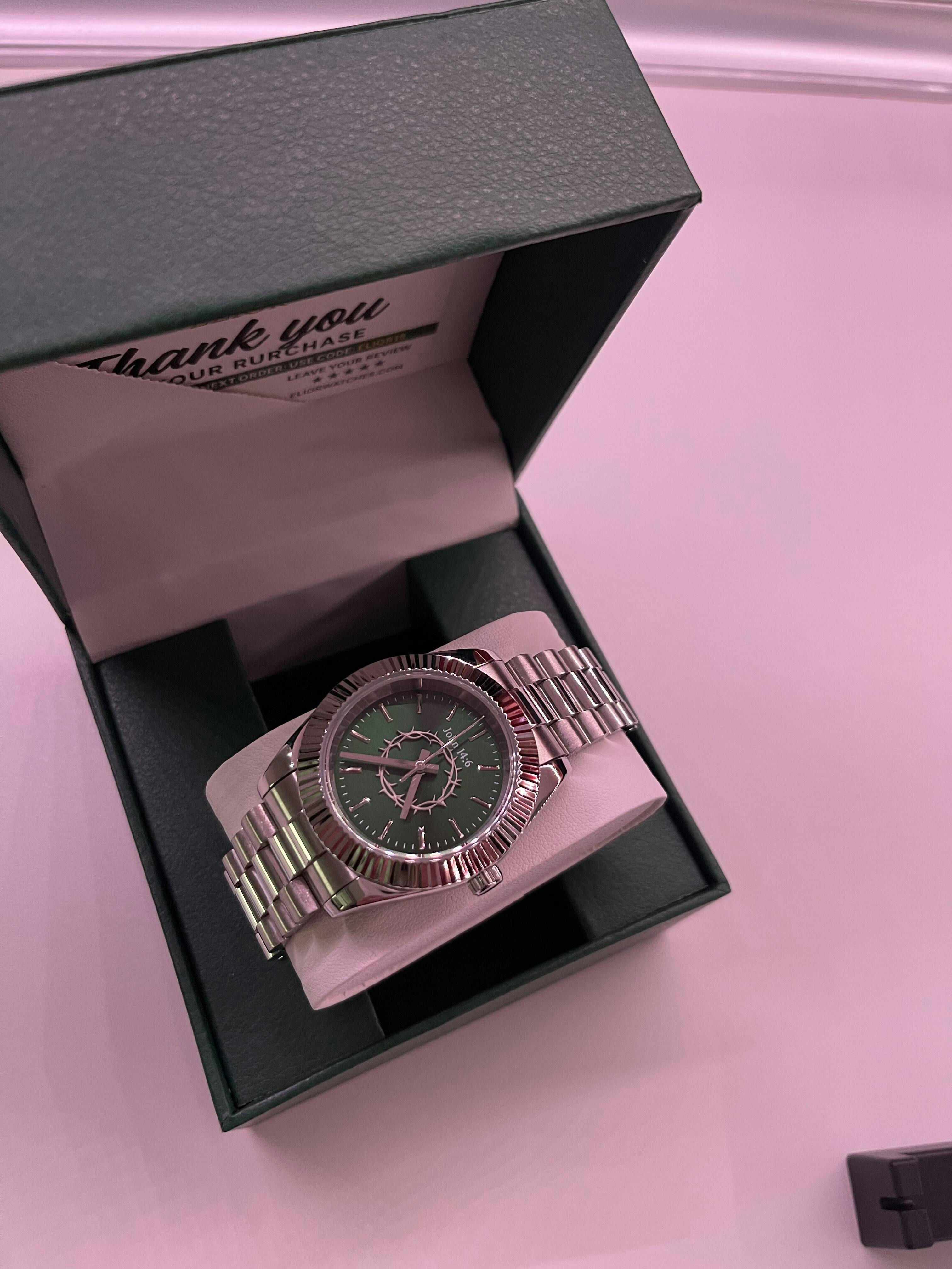 Yes – the center features a raised silver crown of thorns in 3D, set against a deep green sunray dial, while “John 14:6” is engraved at the top.